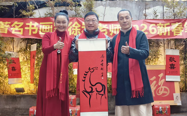 本报讯 (记者 李广义)灵蛇辞旧岁,骏马启新程。近日,著名书画家徐岩应厦门乙丙丁传媒有限公司诚挚邀请,莅临鹭岛厦门,与当地文化界友人、艺术爱好者齐聚一堂,共同举办2026年新春茶话会。手上功夫茶叶有限公司掌门人翁道钊受邀亲临现场助兴,以茶为媒添雅韵。活动以“笔墨传情·同心向新”为主题,在墨香与茶香的交融中,共叙艺术情谊,共话文化传承,为厦门的新春增添了浓厚的人文气息。
