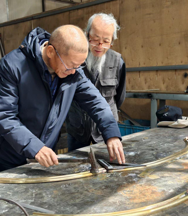 赵秀林(右一)和徒弟浙江盛世铜业丁建永(左一)一起创作