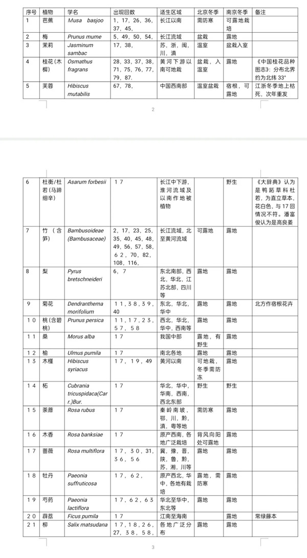 或者有人说:这只是18种植物,还有36种植物在北京越冬是不成问题的!然而,这36种植物正是潘富俊先生所说的热带、温带共通种,在北京、南京都能生长良好!而且,这54种在南京基本上都是常见植物。