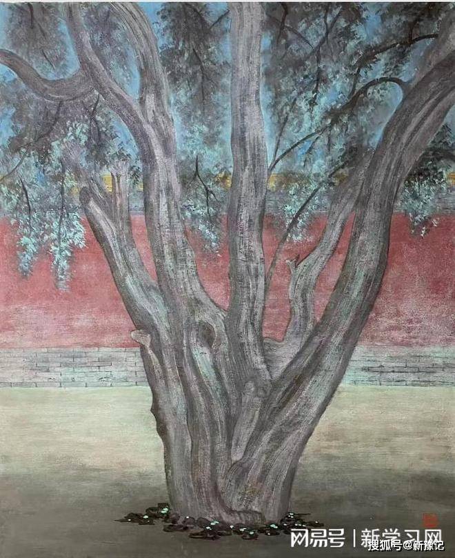 作品《古柏》,描绘的是北京劳动人民文化宫内的古柏树,此幅作品是岩彩与水墨结合的画法。刘铭义用天然岩彩画树的质感,再用水墨加岩彩去画枝叶等细节,在红墙的映衬之下给人一种苍劲而朦胧的神秘感。
