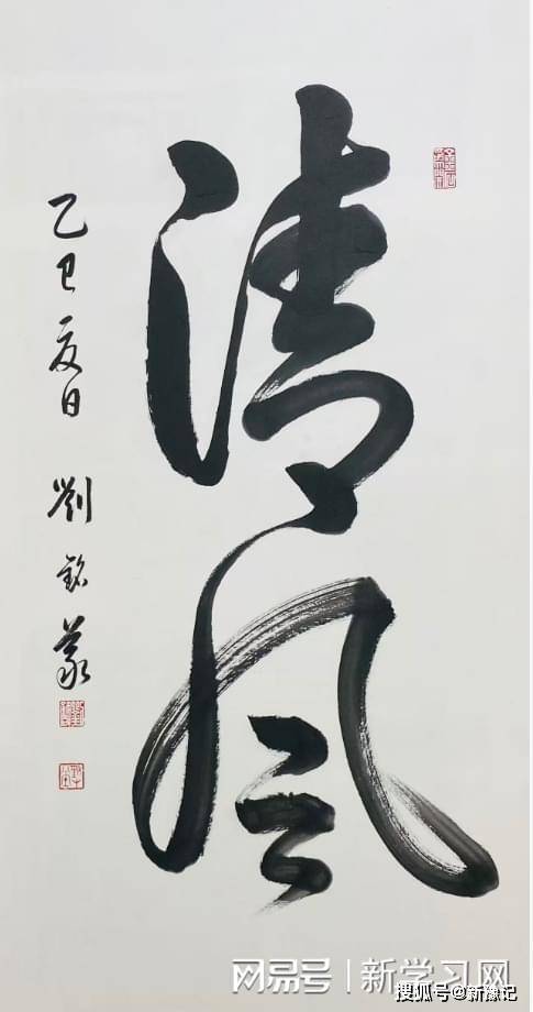 草书《清风》,这幅作品刘铭义用生宣纸,以二王笔法一气呵成。大字清风二字笔法是四面用笔,使转处笔道内方外圆、锋藏于变化之中。