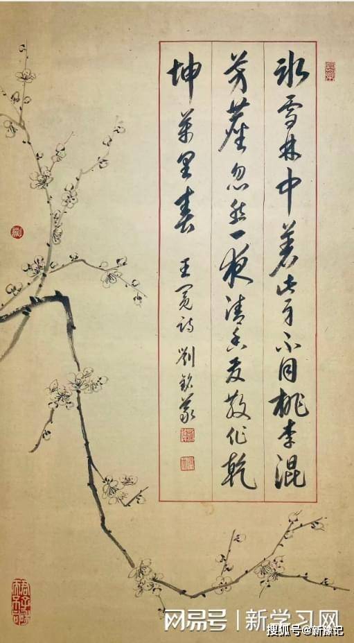 这幅行草《王冕诗》作品,刘铭义用古纸以信笺的形式创作的,红格线内行草与墨梅结合,典雅而新颖别致,受到藏家的青睐。