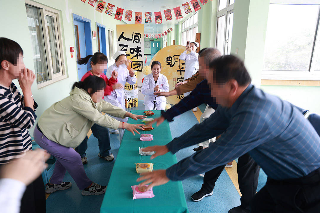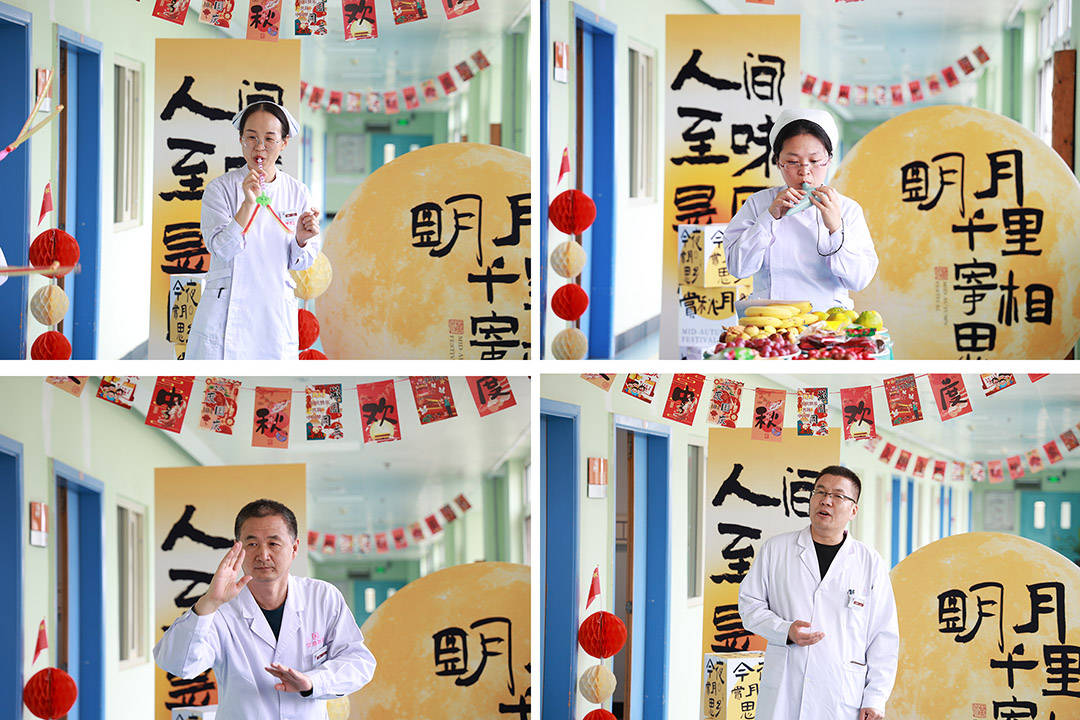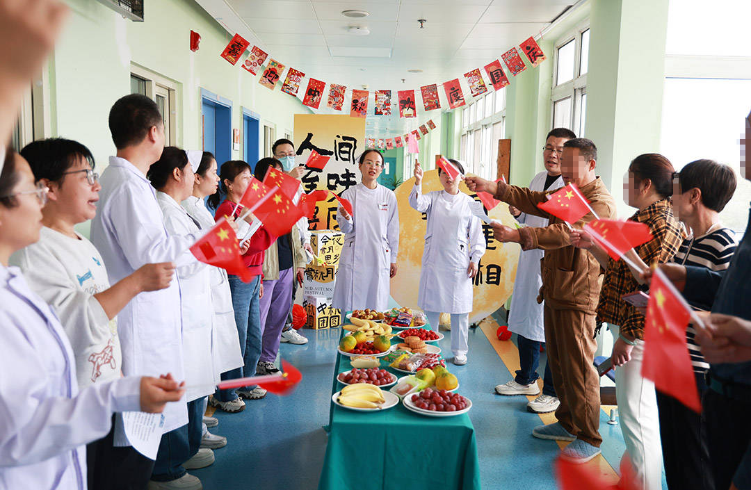 才艺展示环节中,医患双方打破身份界限同台献艺。全体医护人员与患者携手,以充满童趣的《蜗牛与黄鹂鸟》歌舞点燃全场。他们用轻盈的舞姿与清亮的歌声,将病房里的紧张化作中秋佳节的欢笑,连窗外的小鸟都忍不住驻足聆听,似被这纯粹的欢愉打动。李海燕指尖轻抚陶笛,一曲《但愿人长久》如月华倾泻,笛音裹着中秋的思念,在病房的窗棂间流转成银河。尚大夫一曲陕北民歌《一壶老酒》,浑厚嗓音道尽医者夜以继日的坚守;李主任的陈氏太极拳则如行云流水,刚柔相济间尽显中医阴阳之妙。表演落幕,欢声未歇,"抢月饼大战"骤然开启!中秋月饼列队长桌,参赛者屏息凝神如猎豹待发,口令一响便展开指尖争夺,笑语满室。最后,全体人员手持五星红旗,高唱《歌唱祖国》,激昂的旋律如春风化雨,将医者仁心的温暖与赤子爱国的热忱交织成河,流淌在病房的每一寸空间。