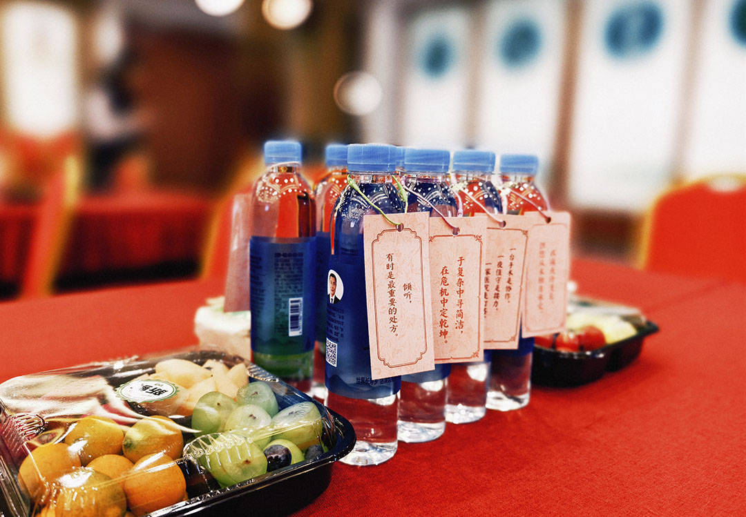 活动伊始,暖场环节以“家的记忆”为主题精心布置。轻柔温暖、充满希望的背景音乐萦绕耳畔,《时光长廊》视频滚动播放着2025年员工风采照片墙,记录下大家微笑、汗水、专注与团队协作的每一帧感动画面。每桌8人跨部门组合,桌上摆放着精美果盘和定制瓶装水,瓶身印有“致敬每一位奋斗的家人”及专属励志寄语,让员工们提前感受到家的温暖与关怀。