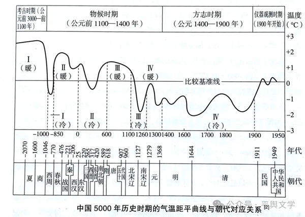 那么,明末清初到底有多冷?可以参考竺可桢先生的《中国近五千年来气候变迁的初步研究》的示意图: