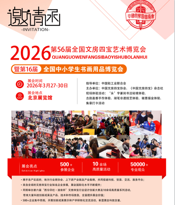 由中国文房四宝协会、《中国文房四宝》杂志社共同主办的“第56届全国文房四宝艺术博览会暨第16届全国中小学生书画用品博览会”定于2026年3月27-30日在北京展览馆隆重举办。届时将有来自广东肇庆、浙江湖州、江西文港、安徽歙县、安徽泾县、四川夹江、杭州富阳、江西婺源、甘肃卓尼等35个产业集群和特色区域的500余家企业及一得阁、戴月轩、周虎臣、曹素功、红星宣纸、西泠印社、马利画材、荣宝斋、朵云轩等头部品牌企业和歙县老胡开文、屯溪胡开文、漳州八宝印泥、成都倚天斋、上海双维印泥、百年墨宝等众多行业新兴品牌企业携最新研发的文房精品与创新成果齐聚一堂,涵盖笔、墨、纸、砚全产业链高、中、低端产品与非遗手工艺精品,集中展现行业科技融合与设计升级的前沿风貌。除此之外,中国工艺美术大师、中国文房四宝艺术大师梁佩阳、蔺涛、莫伟坤,中国文房四宝艺术大师马志良、杨松源、钱建梁、章小华、李小平、刘嘉兴、 梁德常 汪顺清、李耘萍、刘华、刘靖、杜吉河等将亲临展会现场为观众带来大师级创作技艺的现场展示,通过笔墨间的气韵流转,展现中华传统书画艺术的深邃意境。