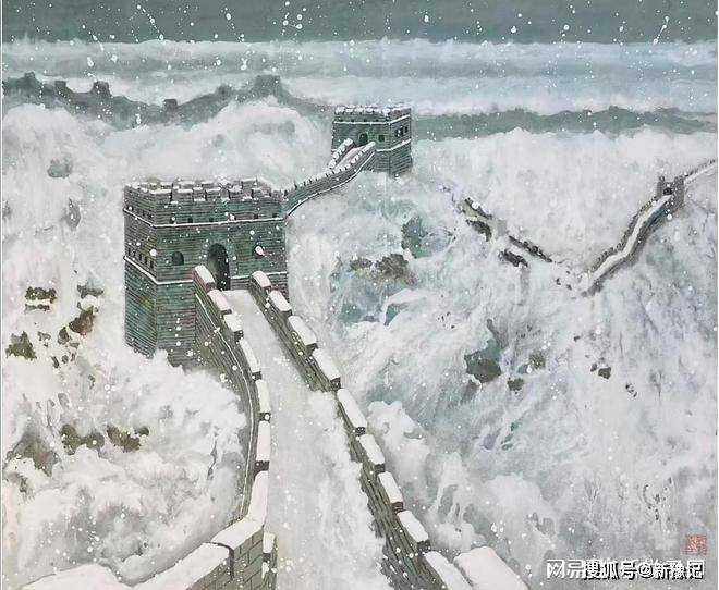 作品《冰雪》,描绘的是北京长城雪景,在技法上刘铭义用天然岩彩烧制后,用色多层叠加渗透画出长城和山石,最后再用胡粉(白色)渲染和泼彩的方法去覆盖,表现交融、流动透明的冰雪艺术效果。