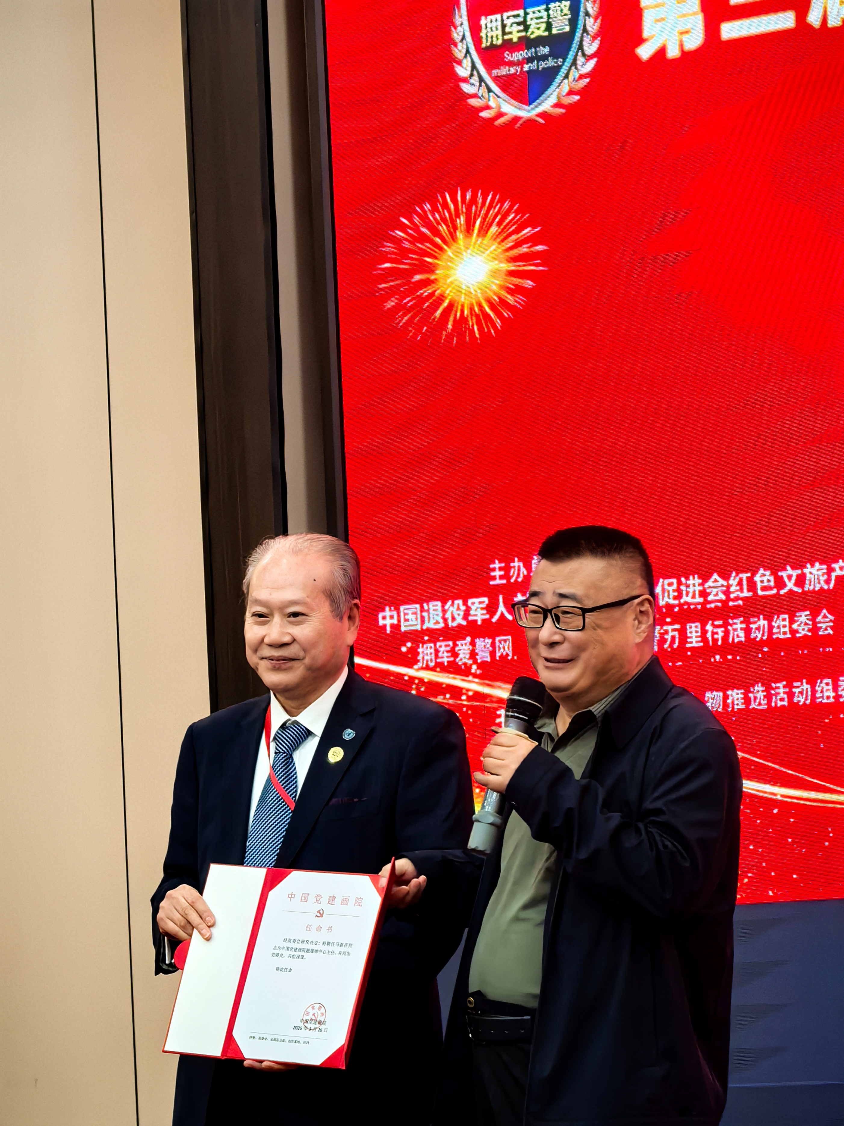 会议现场气氛热烈,荣誉表彰环节将活动推向高潮。主办方为新时代拥军爱警公益人代表、企业家代表、企业代表、公益大使代表及践行者代表隆重颁发了牌匾,表彰先进,树立典型,激励更多人投身新时代拥军爱警公益事业。中国党建画院院长张文祥赠送了书画作品,并为马新存颁发了中国党建画院融媒体中心主任聘书,以文化力量赋能拥军爱警宣传工作。
